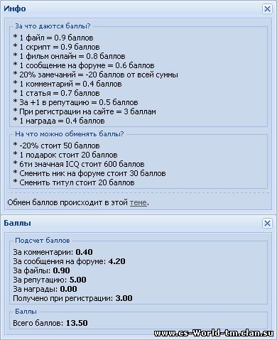 <script type="text/javascript">$(document).ready(function(){var cmnt = $_COM_ENTRIES$*1; var snyat = $_PHOTO_ENTRIES$*1.0; var load = $_LOAD_ENTRIES$*1; var ncmnt = cmnt.toFixed(2); var tfrm = $_FORUM_ENTRIES$*1.0; var ntfrm = tfrm.toFixed(2); var nload = load.toFixed(2); var repa = $_REPUTATION$*0.1; var nrepa = repa.toFixed(2); var adwr = $AWARDS$*0.1; var nadwr = adwr.toFixed(2); var pred = $_BOARD_ENTRIES$; var regs = 5; var norm = cmnt+tfrm+load+repa+regs-pred-snyat; bans = 0;var bans = ((norm/100)*$_BAN_PERCENT$); var aftr = norm-bans; var aftr = norm; bans = 0;var resalt = aftr.toFixed(2); _why = '<fieldset><legend>Баллы за активность:</legend>За комментарии: <b>' + ncmnt + '</b><br>За сообщения на форуме: <b>' + ntfrm + '</b><br>За материалы: <b>' + nload + '</b><br>За репутацию: <b>' + nrepa + '</b><br>Получено при регистрации: <b>5.00</b><hr></b>Минус баллов из-за замечаний: <b>' + bans + '</b><br>Снято баллов: <b>' + snyat + '</b> </fieldset><fieldset><legend>Баллы</legend>Всего баллов: <b>' + resalt + '</b><br></fieldset>'; $("#raitng").html(resalt);});</script> 2. А там, где хотите увидеть кнопки, вставьте такой код: <div class="udtb"><div class="udtlb">Баллы:</div><b><a href="#" id="raitng" onclick="new _uWnd('rait', 'Баллы', 390, 200, {align: 0},_why);return false;">загрузка</a></div></b>